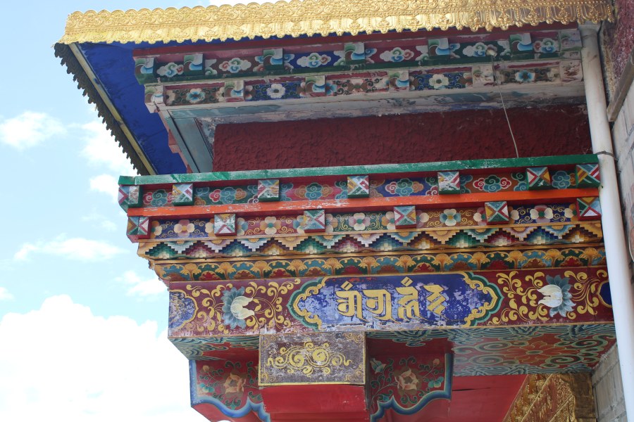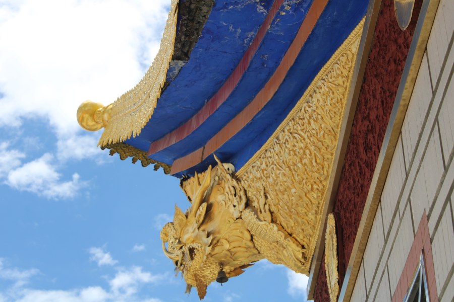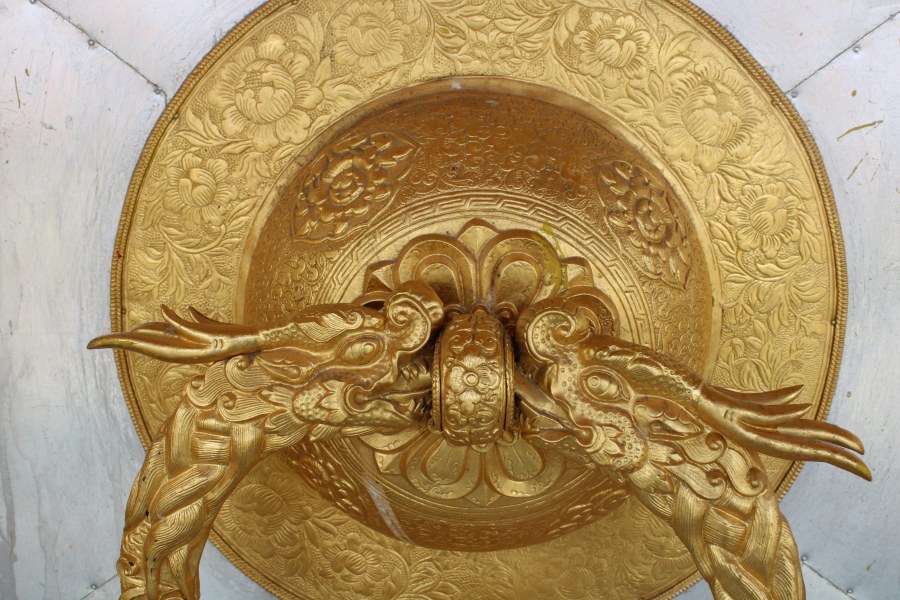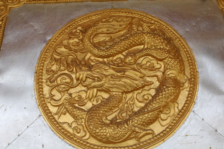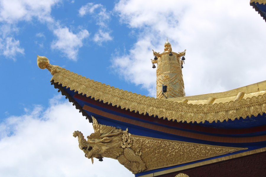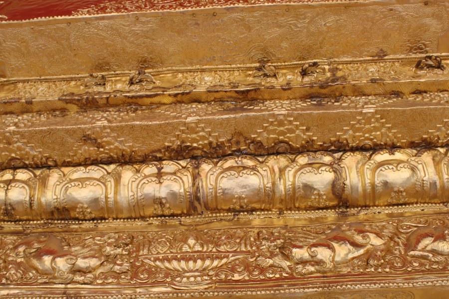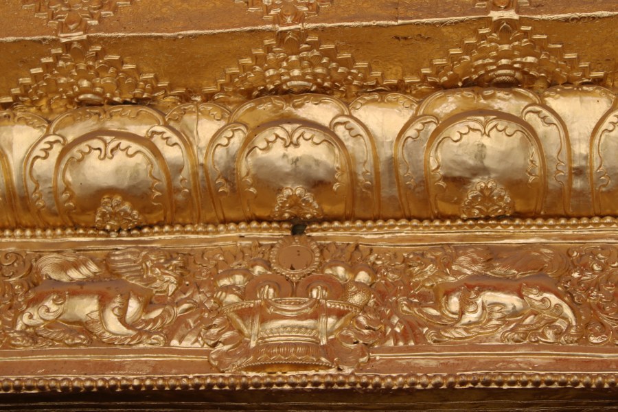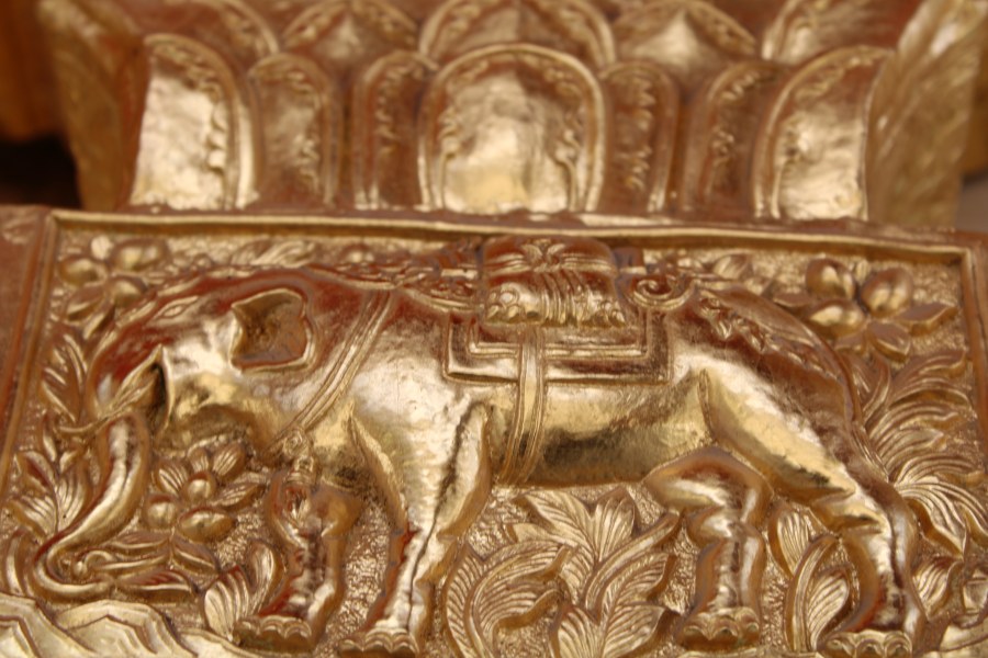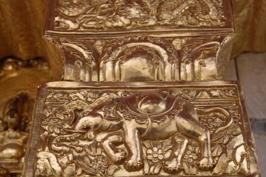 我拍了一些金塔装饰的细节,有龙有象,龙属于冥众八部之一;象是转轮圣王七宝之一,非常吉祥。金塔外檐还有金鹿、鳌头、金翅鸟、宝幢等贴金饰物。