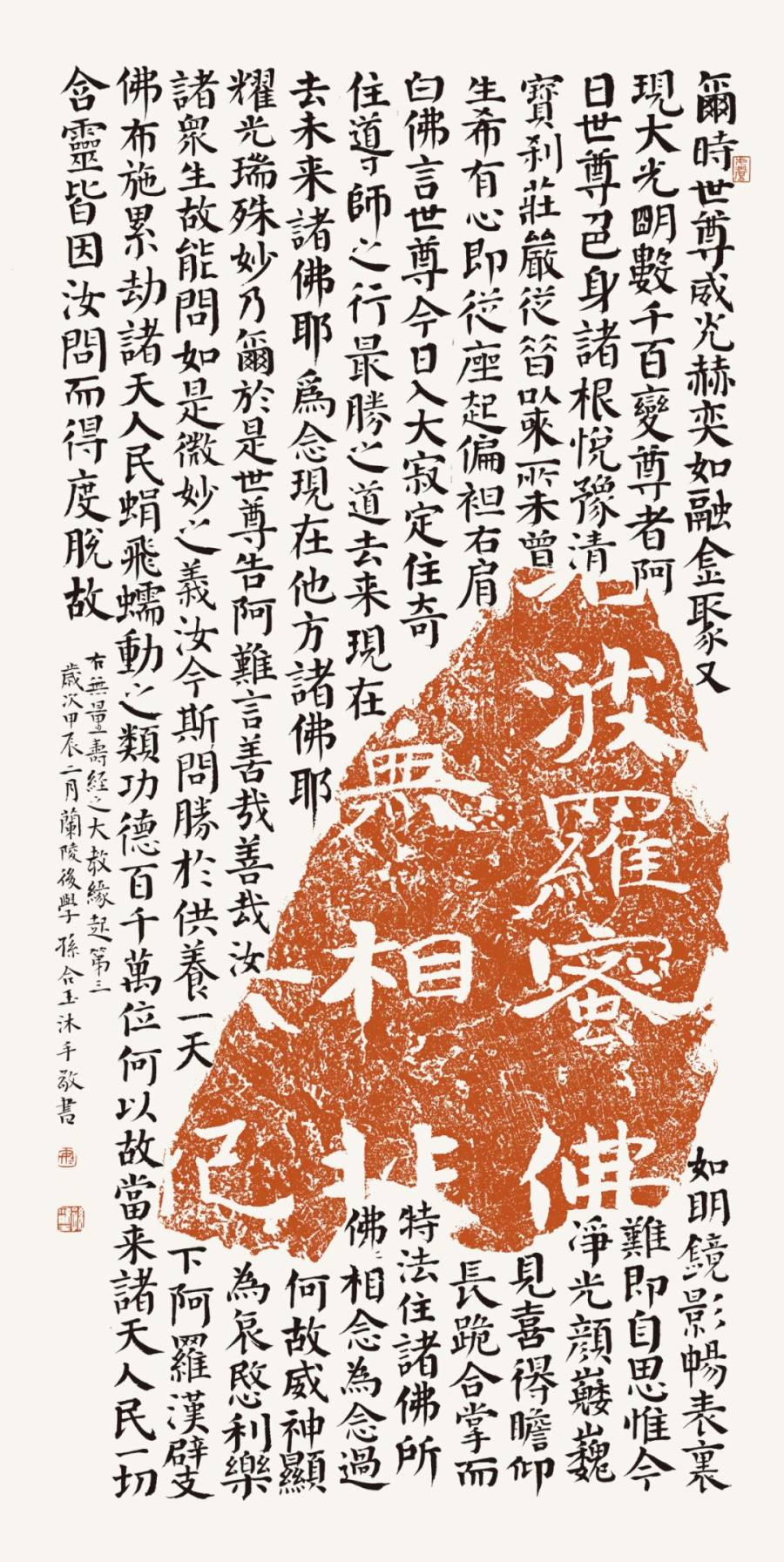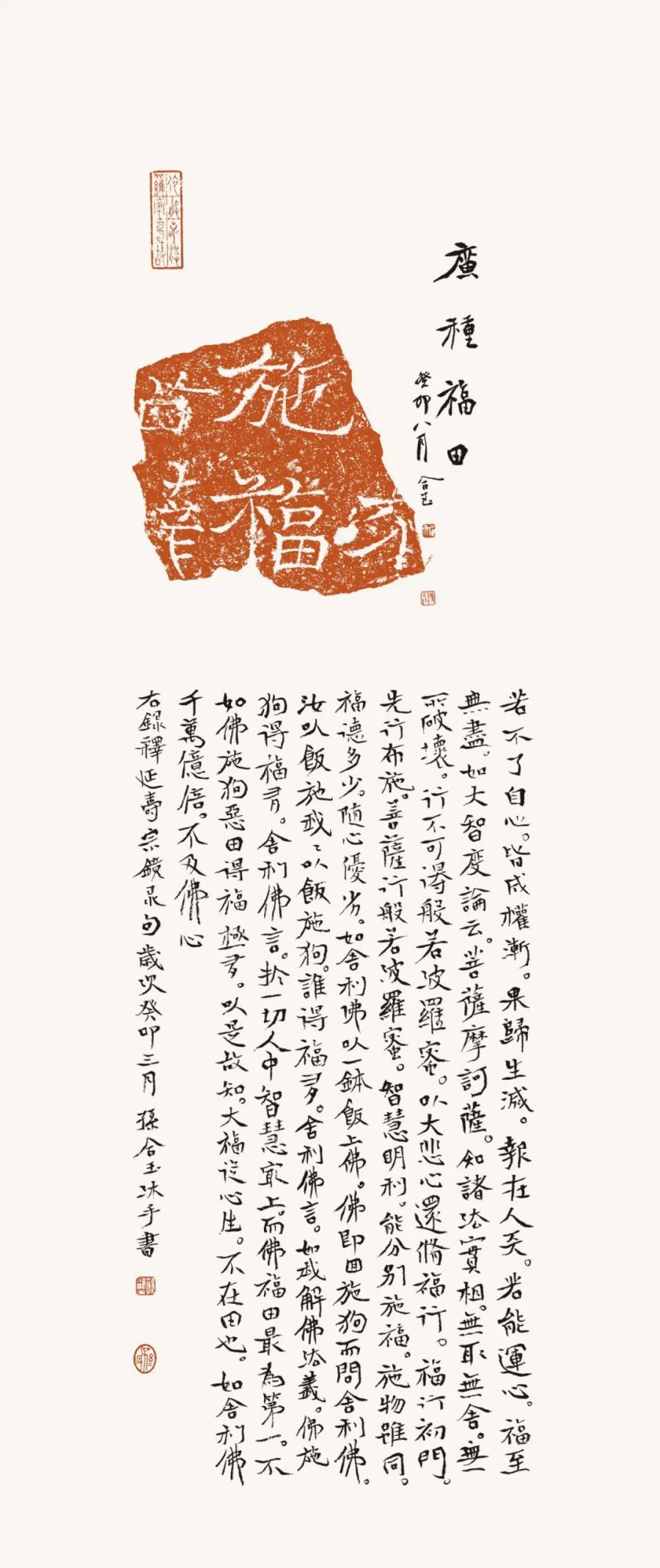 如大智度论云。菩萨摩诃萨。知诸法实相。无取无舍。无所破坏。行不可得般若波罗蜜。以大悲心。还修福行。福行初门。先行布施。菩萨行般若波罗蜜。智慧明利。能分别施福。施物虽同。福德多少。随心优劣。如舍利弗以一钵饭上佛。佛即回施狗。而问舍利弗。汝以饭施我。我以饭施狗。谁得福多。舍利弗言。如我解佛法义。佛施狗得福多。舍利弗者。于一切人中智慧最上。而佛福田最为第一。不如佛施狗恶田得福极多。以是故知。大福从心生。不在田也。如舍利弗。千万亿倍。不及佛心。右录释延寿《宗镜录》句。岁次癸卯三月,孙合玉沐手书