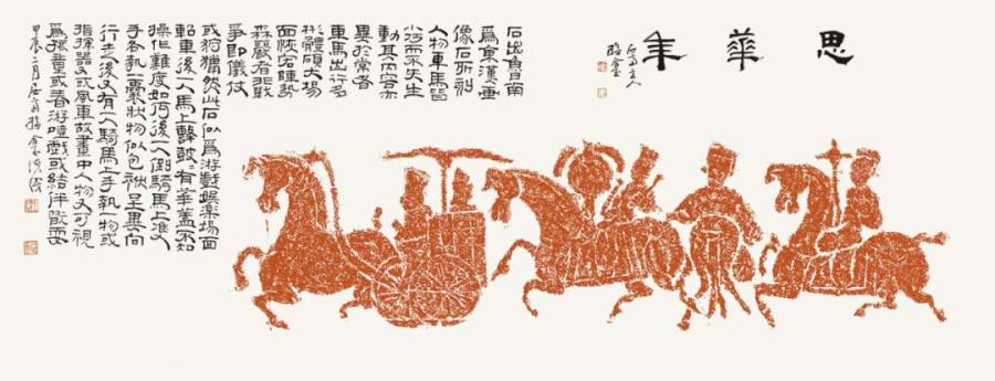跋:石出鲁南,为东汉画像石。所刻人物车马皆小巧而不失生动,其内容亦异于常者。车马出行多形体硕大,场面恢宏、阵势森严者,非战争即仪仗或狩猎,然此石似为游戏娱乐场面。轺车后一人马上击鼓,鼓有华盖,不知操作难度如何,后一人倒骑马上,双手各执一囊状物似包袱,呈异向行走,后又有一人骑马上,手执一物或指挥器又或风车,故画中人物又可视为孩童,或春游嘻戏,或结伴玩耍。甲辰二月屉斋孙合玉浅识
