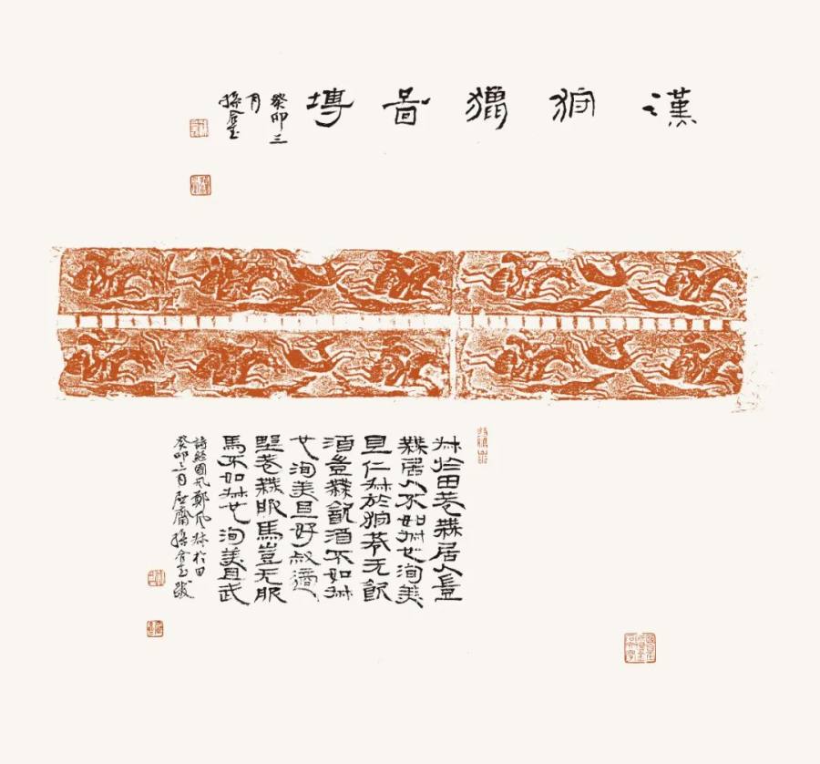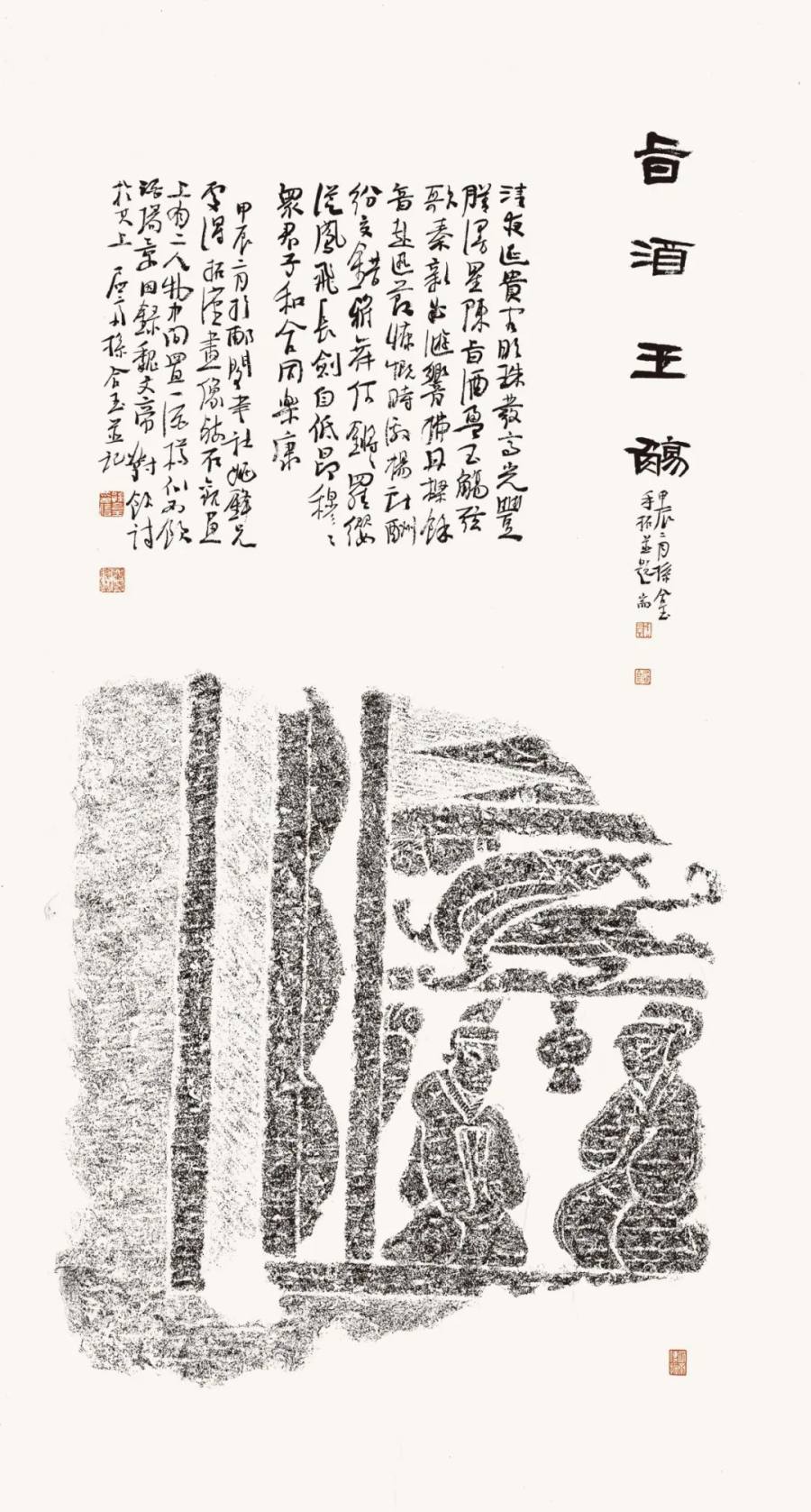 跋:清夜宴贵客,明珠发高光。丰膳漫星辰,旨酒盈玉觞。弦歌奏新曲,游响拂丹梁。余音赴迅节,慷慨时激扬。献筹纷交错,雅舞和锵锵。罗缨从凤飞,长剑自低昂。穆穆众君子,和合同乐康。甲辰二月于郙阁书社姚锋兄处得拓汉画像残石,观画上有二人物,中间置一酒尊,似为饮酒场景,因录魏文帝《对饮》诗于其上,孙合玉并记。