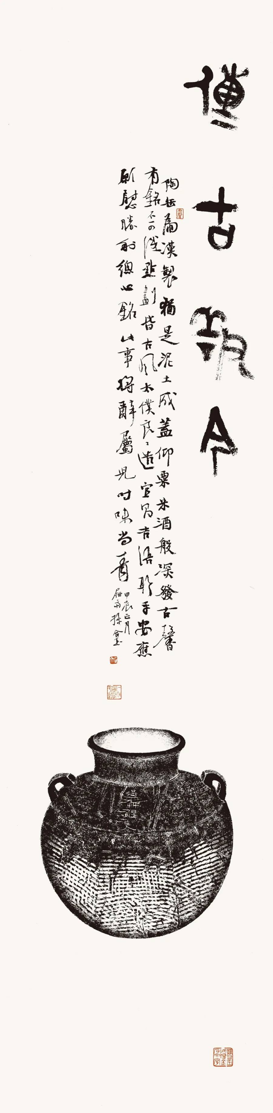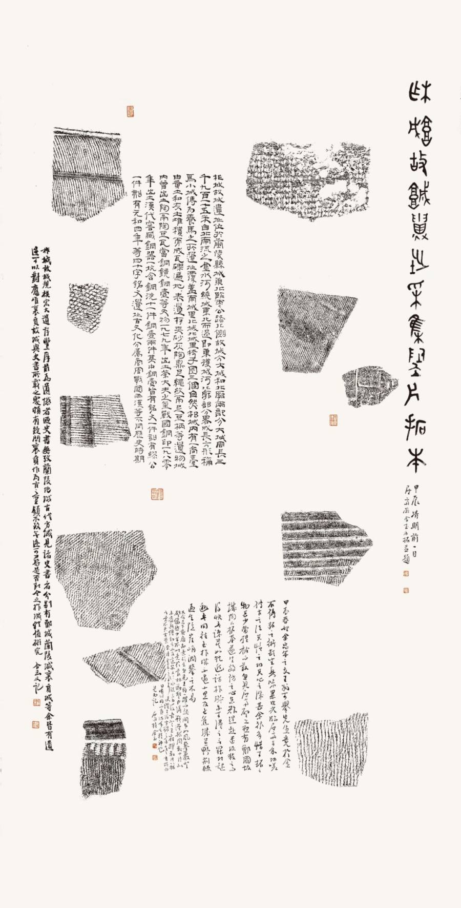 跋二:甲辰仲春始,余忘年之交王翁可举先生竟于金石传拓之术顿生兴味,累次光临屉斋求索传古之法,其情之切、其意之诚,甚余良多,惜可拓之物甚少,常捏衿而叹。一日忽见屉斋壁上悬有鄫国故城陶片拓本,似豁然开朗,思路大开,急欲赶赴遗址,获之而后快。吾谏其莫如就近访柞城,亦可得之,言罢即起,邀吾同往。塔山至柞城不过十里,驱车便至。但见旧城荒野,荆棘遍生,陡崖峭壁,攀之不易,又念之足下新履,顿生却意。忽见王翁一跃直起,阔步如风,攀岩登壁,俨然少年。不时竟于丛林断壁中得战汉残陶数十片,兴奋之情溢于言表,似未尽兴,缕劝方止。及还家,又一一水洗、晾晒。数日后,吾登王府,择数片以拓之,竟不失古意,颇得金石之气耳。更赞王翁年逾七十,能得日有所好、老有所乐,不负流年之晚,为吾辈楷模者也。是为记。