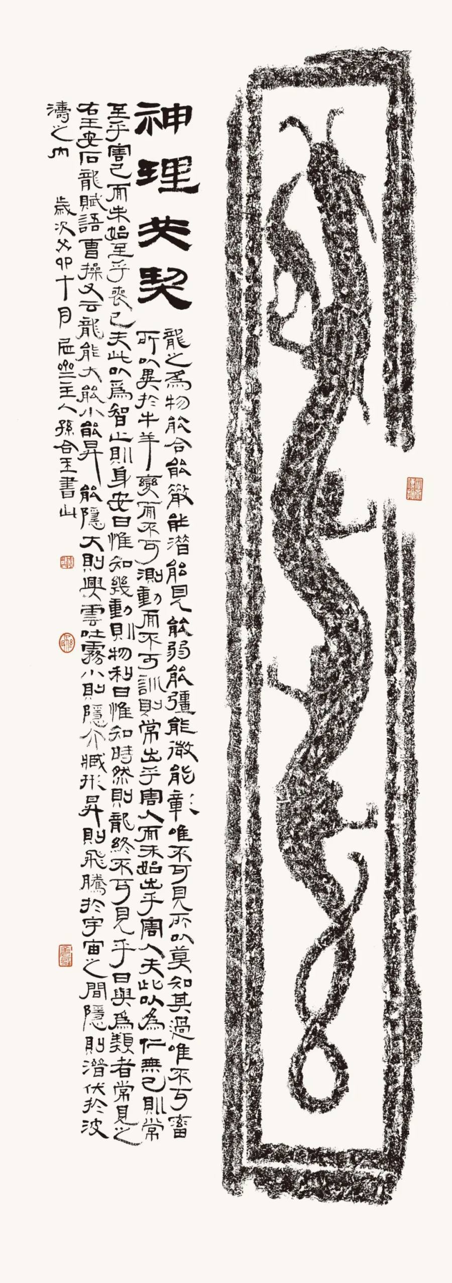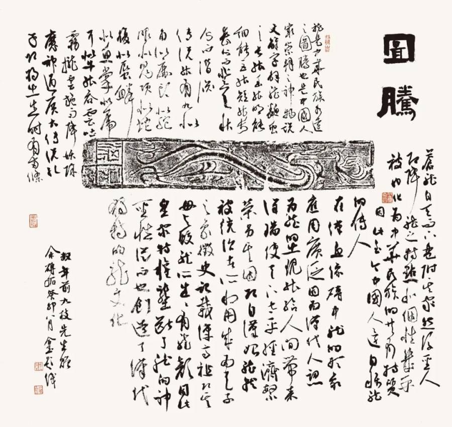 跋:龙是中华民族永远之图腾,也是中国人最崇拜之神物。《说文解字》解:龙,鳞虫之长,能幽能明,能细能巨,能短能长,春分而登天,秋分而潜渊。传说龙有九似,角似鹿,头似驼,眼似鬼,项似蛇,腹似蜃,鳞似鱼,掌似虎,耳似牛,能吞云吐雾,拢云施雨,降妖除魔,神通广大。传说孔子即将出生时,有两条苍龙自天而下,盘附其家,然后圣人即降。龙之特点和个性几乎被内化为中华民族的共有特质。因此,至今中国人还自称龙的传人。在汉画像砖中,龙的形象应用广泛,因为汉代人认为龙的出现能给人间人带来祥瑞,使天下太平,经济繁荣,另其因即自汉始,龙就被统治者所利用,成为天子之象征。《史记》载,汉高祖即其母与蛟龙所生,生有龙颜。因此,皇家特权垄断了龙的神圣性,从而也创造了汉代独特的龙文化。数年前,九枝先生赠予砖拓,癸卯八月,合玉题识。
