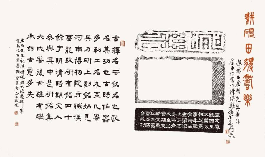 跋:古释名云铭名也,记名其功也,古时作器多勒工名,及至几案兵刄,砚上刻铭始见河南博物院所藏汉云龙纹砚,有铭四十余字,明清时期文人参与其中,是砚铭集大成者,后世虽有继承,然古意多失。金成先生刻汉砖砚铭,以张迁碑笔意为之,古意尽显。癸卯冬合玉敬跋。