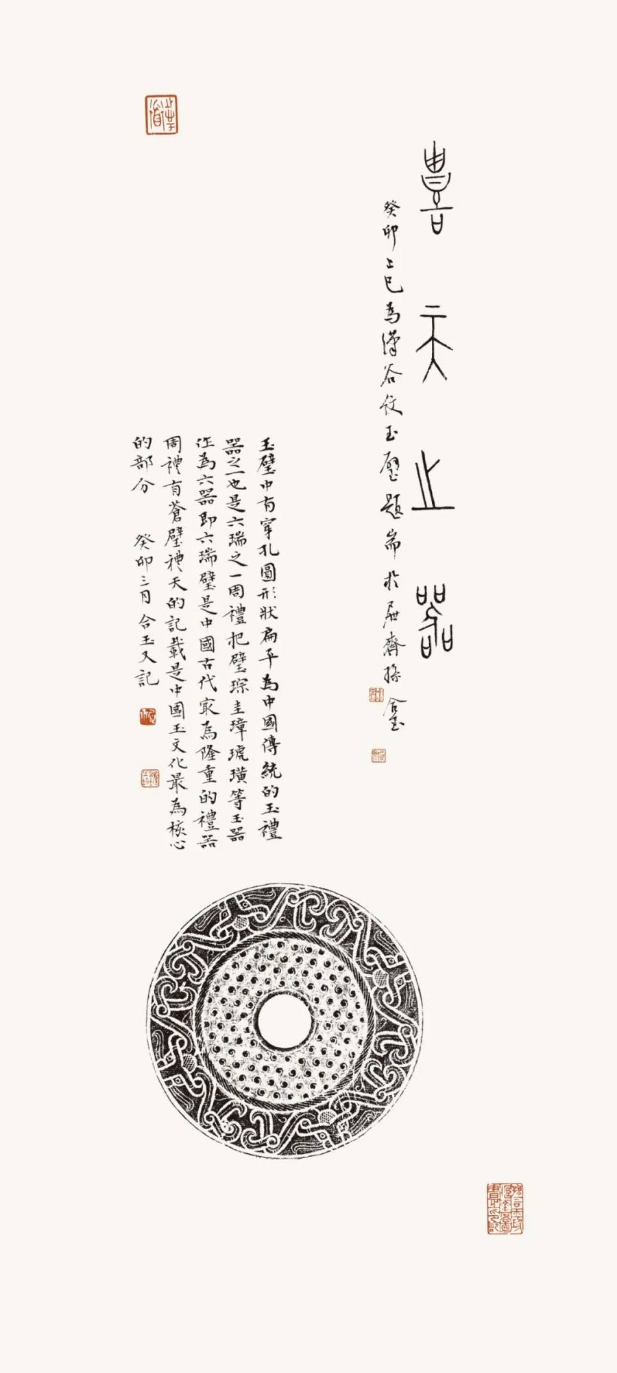 跋:玉璧中有穿,孔圆形,状扁平。为中国传统的玉礼器之一也,是六瑞之一。周礼把璧、琮、圭、璋、琥、璜等玉噐作为六器,即六瑞。璧是中国古代最为隆重的礼器,周礼有苍璧礼天的记载,是中国玉文化最为核心的部分。癸卯三月合玉又记。