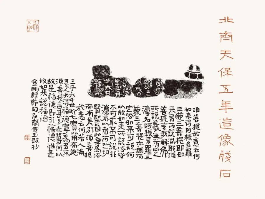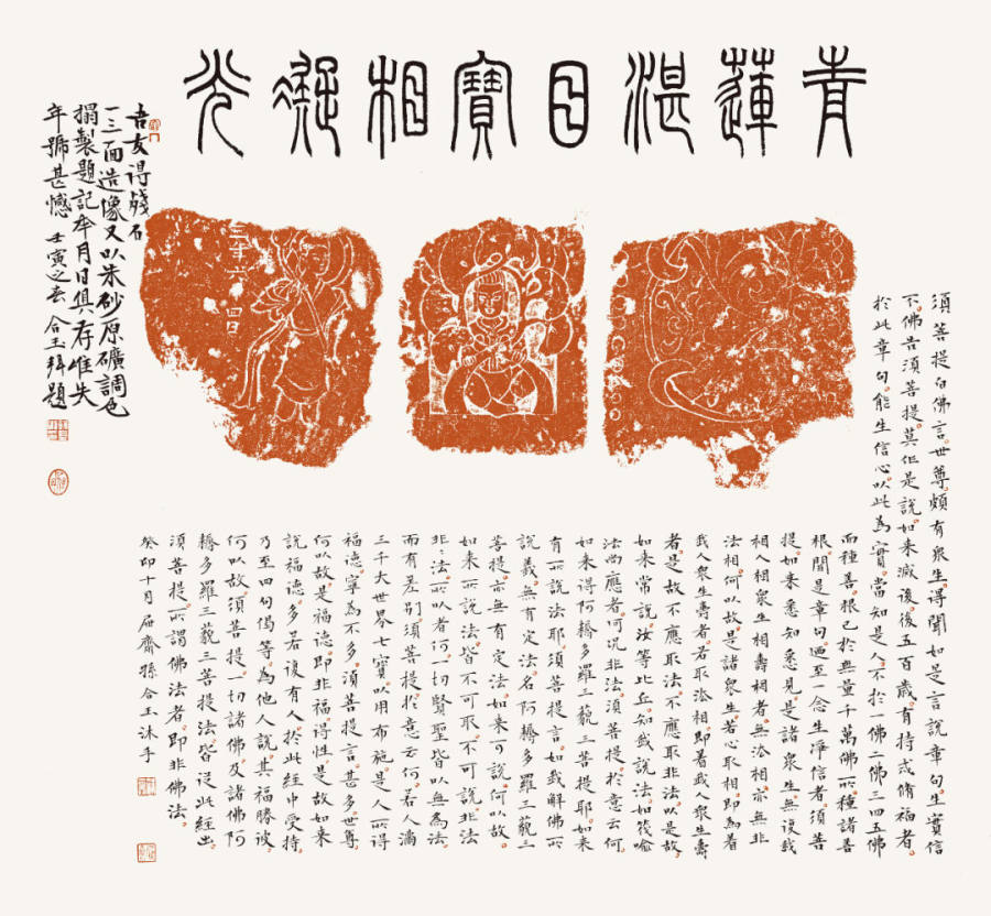 跋一:吾友得残石一,三面造像,又以朱砂原矿调色拓制。题记年月日具存,惟失年号,甚憾。壬寅之春合玉拜题