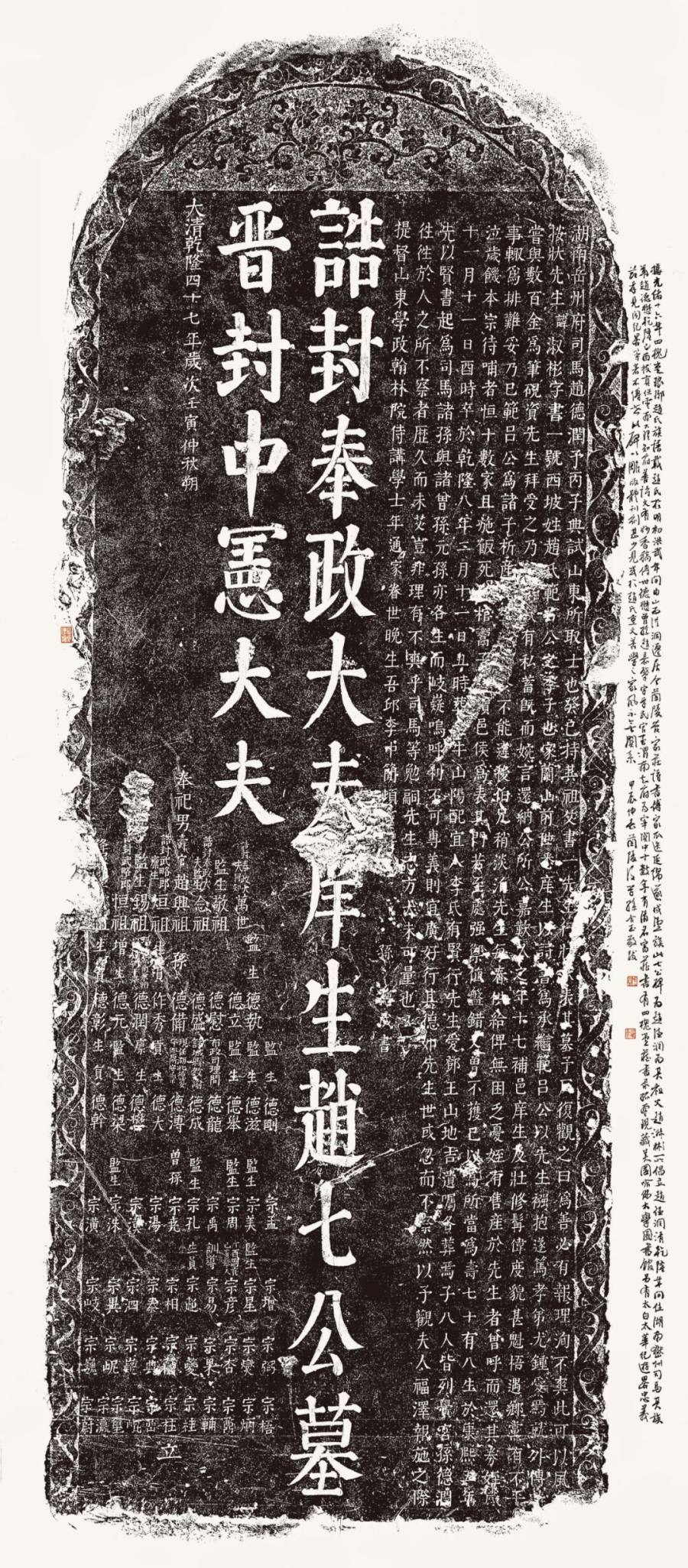 跋:据光绪十六年《四槐堂琅琊赵氏族谱》载,赵氏于明初洪武年间由山西洪洞迁居今兰陵管家庄,诗书传家,瓜迭延绵,遂成望族。此七公碑,为赵德润为其祖父赵淑彬所倡立。赵德润,清乾隆年间任湖南岳州司马,其族弟赵德懋乾隆乙酉拔贡,任云南大理知府,善诗文,有《妙香斋诗集》传世。德懋曾孙赵嘉肇,字孚民,官至渭南知府,为宰关中十数年,有清名,富藏书,有《四怀堂藏书录》,孤本现藏美国哈佛大学图书馆。另有《太白太华记游略》、《忠义节孝见闻记略》等著述传世。此碑以雕版体刊刻,甚少见,或与赵氏重文善学之家风不无关系。甲辰仲春,兰陵后学孙合玉敬跋