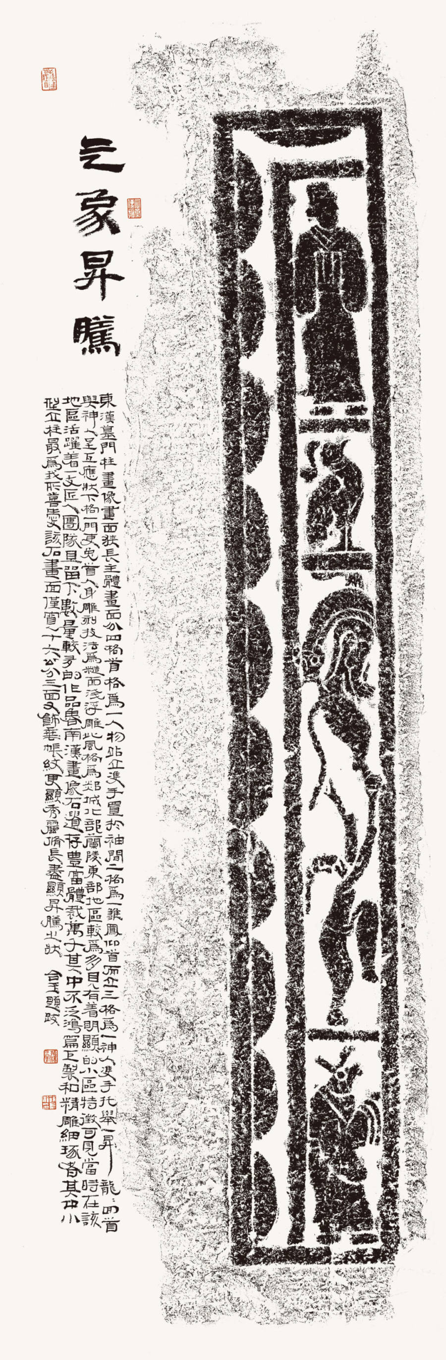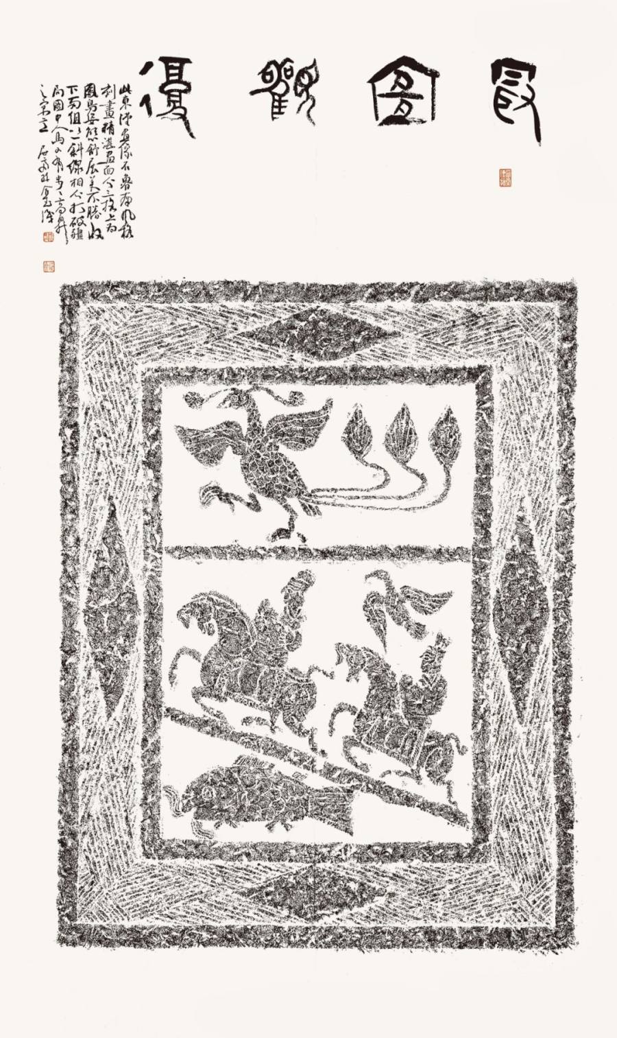 跋:此东汉画像石,鲁南风格,刻画精湛。画面分三格,上为凤鸟,姿态舒展,美不胜收。下两组以一斜线相分打破僵局,图中人马又有步步高升之寓意。屉斋孙合玉识