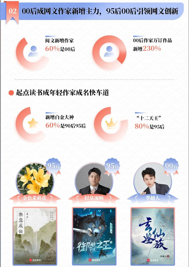 2022年中国网络文学发展研究报告显示,阅文集团2022年新增注册作家中,00后占比高达60%。2022年作家指数TOP500的新面孔中,00后占比提升10%。而且,2024年新晋白金大神作家更有近半数在30岁以下。