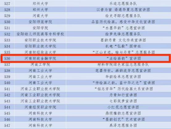为了深入学习贯彻习近平文化思想,落实党的二十大精神,团中央青年志愿者行动指导中心牵头向全国大学生遴选2024年“中国历代绘画大系”志愿宣讲团,河南财政金融学院法学院“法绘画韵”志愿宣讲团从全国657所高校的数千支大学生志愿服务团队中脱颖而出、成功入选。