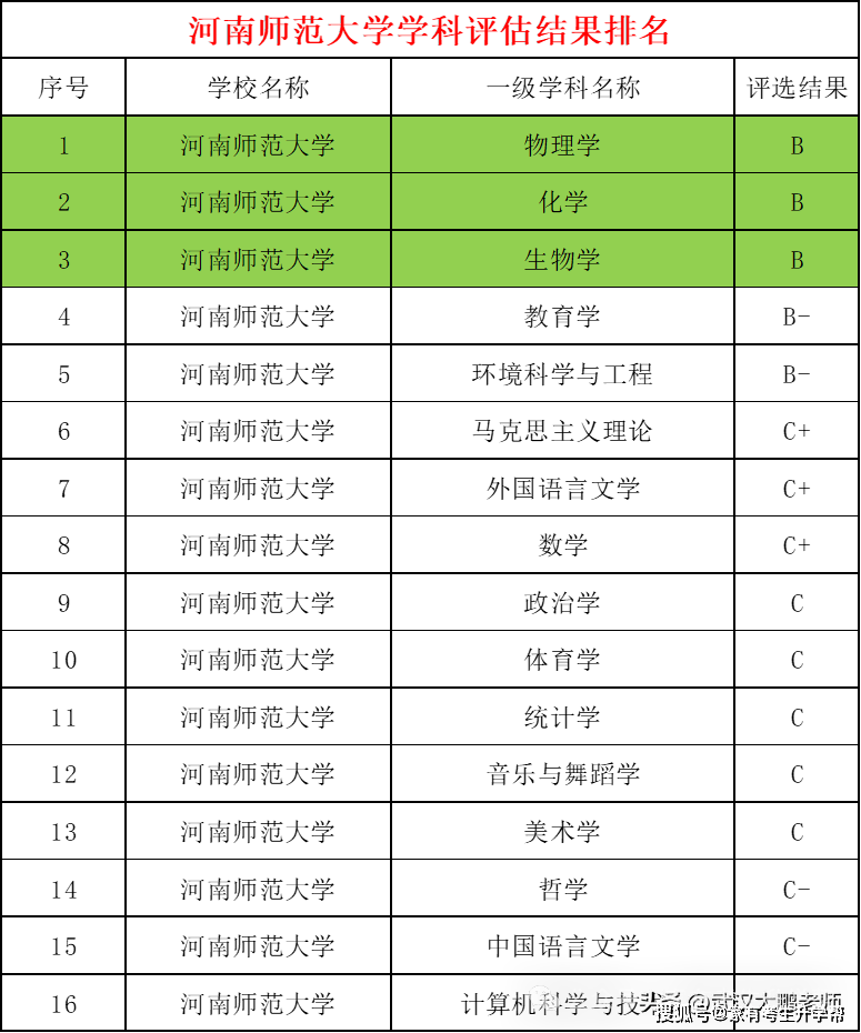 河南师范大学物理、化学、生物实力很强,第四轮学科评估被评为B,教育学、环境科学与工程被评为B-,