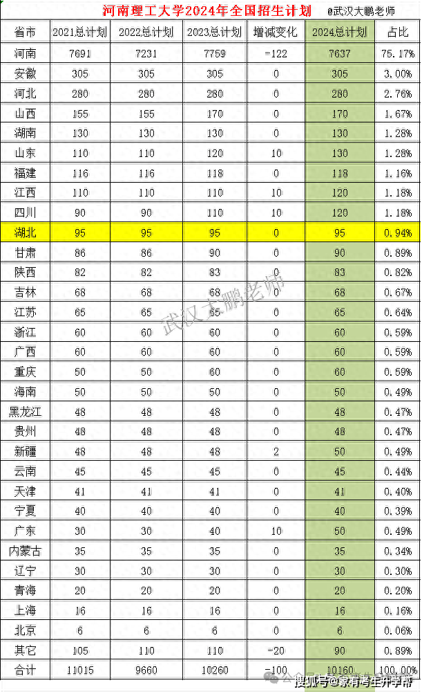 河南理工大学2024年招生计划发布,共招本科新生10160人,比2023年减招100人,对河南招7637人、减招122人,省内考生占比减至75.17%,省外生源中安徽305人、河北280人、陕西170人位居前三。