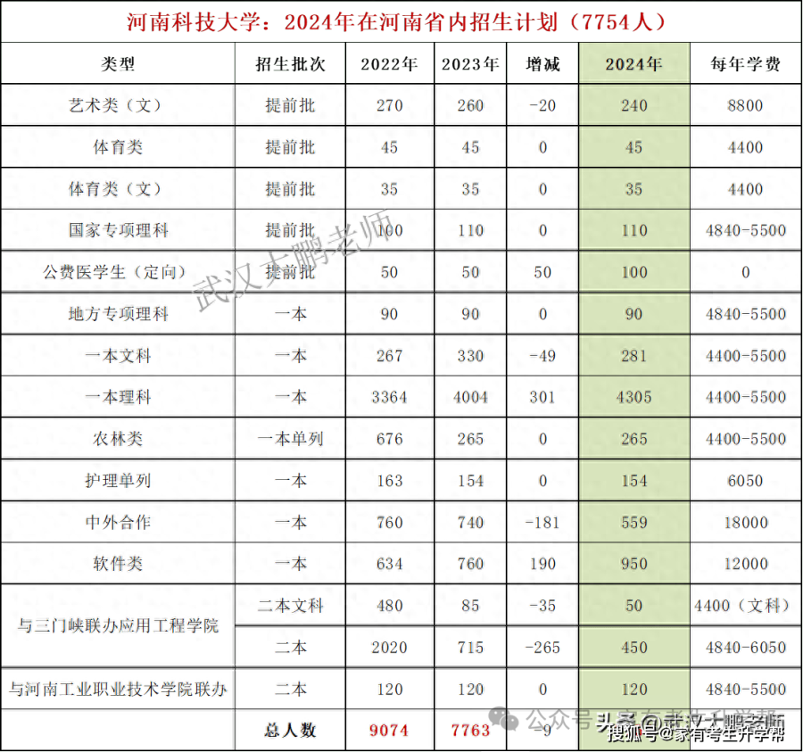 2022年河南科技大学在河南招9074人、2023年招7763人、2024年招7754人,呈逐年下降趋势;2024年对河南招生变化主要体现在以下几方面