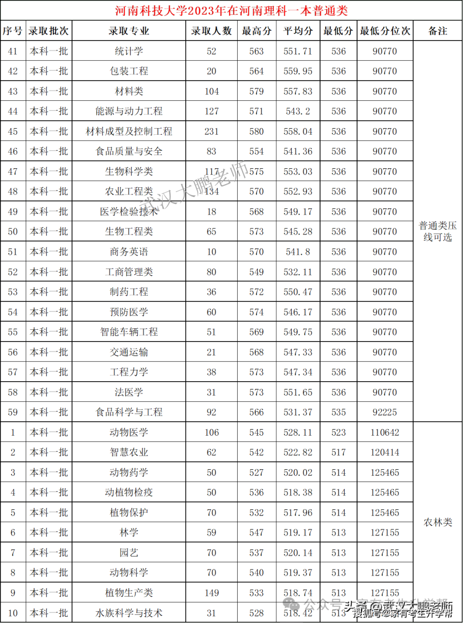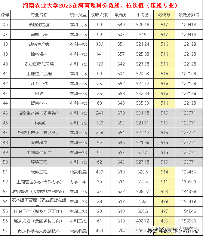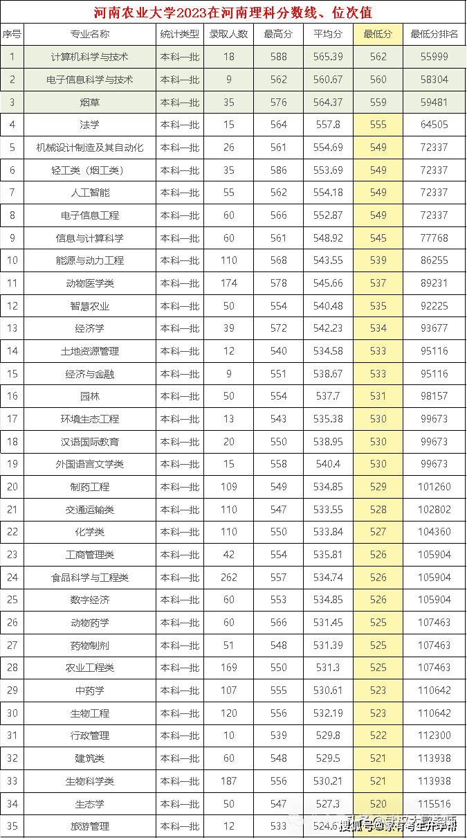 河南农业大学2023在河南理科各专业分数线、位次