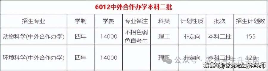 4.增加中外合作二本批次招生计划275人,投档两个专业,动物科学155人、环境科学120人。学费1.4万。