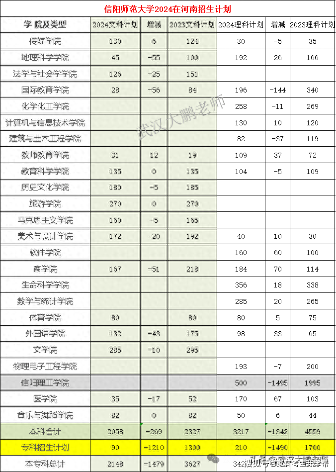 理科:本科招生计划3217人、减少1495人;其中信阳师范大学心信阳理工学院2024年仅招500人,减少1495人,其他学院基本稳定。理科专科计划仅招210人,减少1490人。