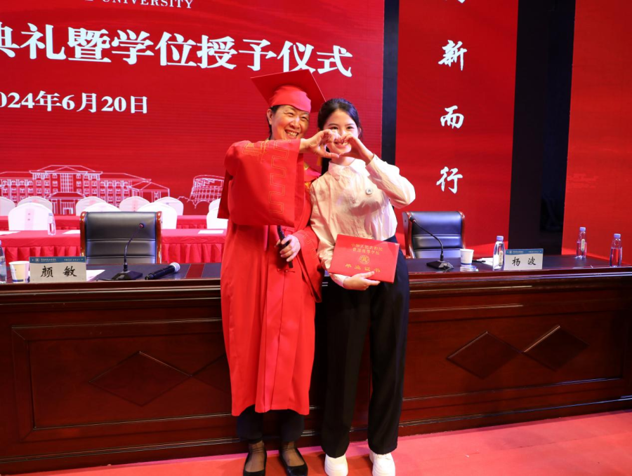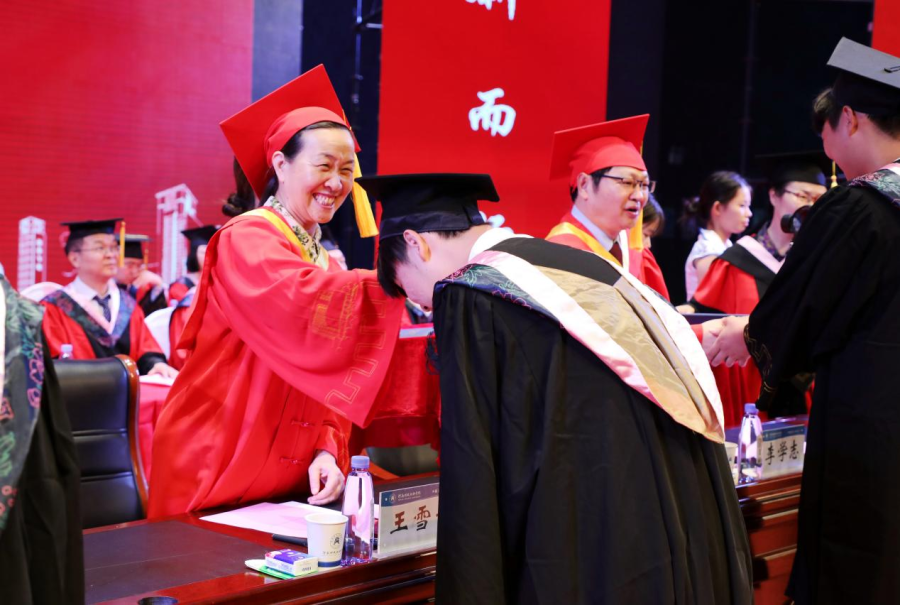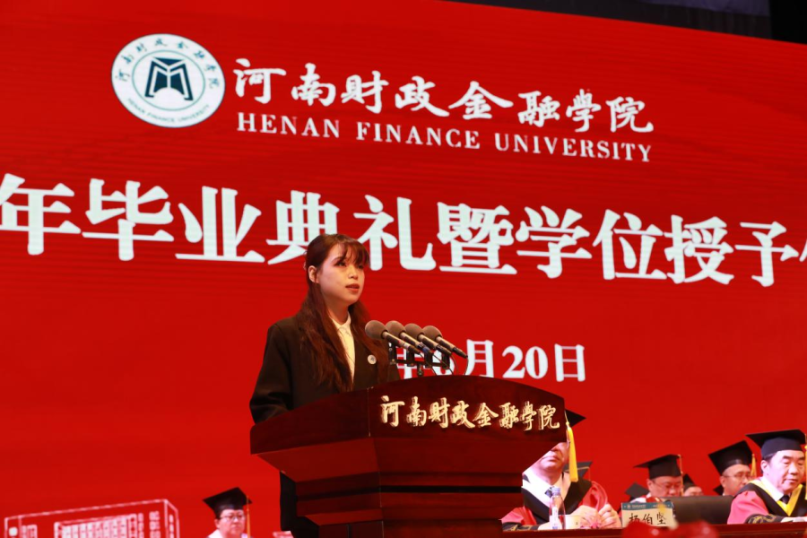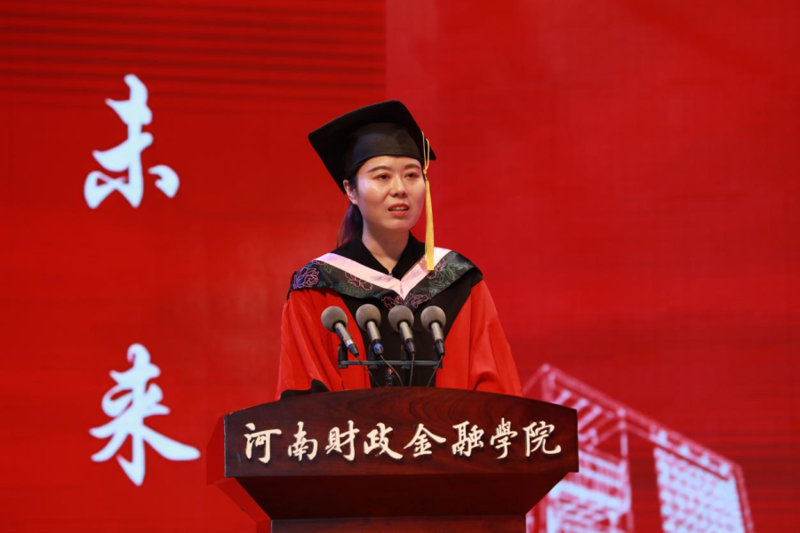 毕业生代表郭安琪回顾了自己在校四年青春时光,诚挚表达了对师长的感恩和对母校的不舍,表示将牢记“明德笃学 知行合一”的校训,不负时代、不负韶华。