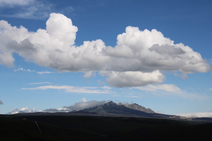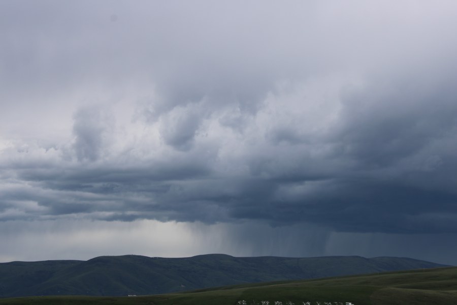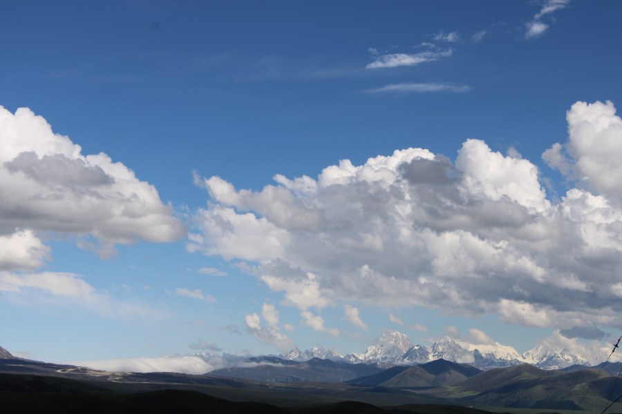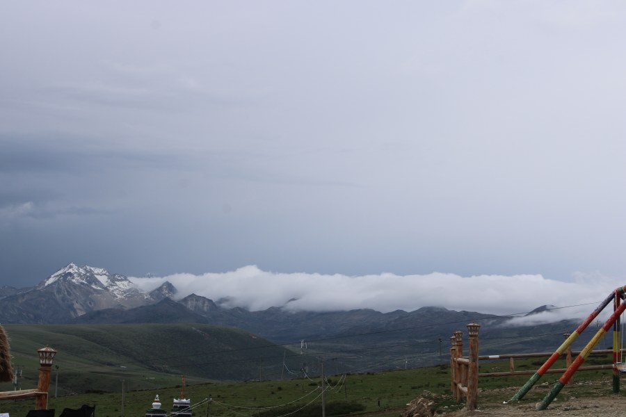 高原风云变幻,远处天雨如注;远处云压山岭,都是人间难得的景色。