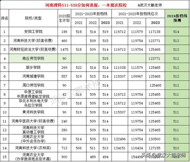 新晋一本批次招生的院校,一般投档线都不会太高,预计安阳工学院、商丘师范学院、新乡学院、河南城建学院、周口师范学院、黄河科技学院等这些刚进一本批次招生的院校,一般都是压线投档,2024年511-515分以下考生报考比较稳,一般不会滑档。