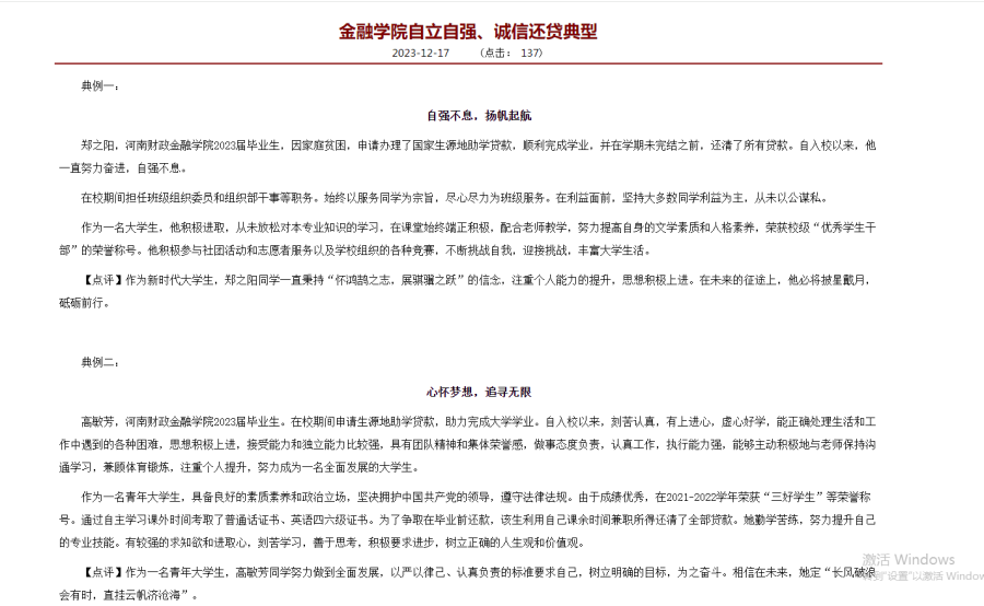 建好大学生诚信档案管理平台。该校学工部出台《河南财政金融学院学生诚信档案管理办法》,在新生入学时为每名学生建立诚信档案,将学生在校期间的表现如实记录到个人诚信档案中。诚信档案内容包括学习成绩、在校优良记录、在校不良记录、助学贷款情况、学风考风情况、欠缴学费情况、偿还贷款情况以及其他表现情况,主要指标涉及学习诚信、经济诚信、生活诚信、学籍档案诚信、贷款与受助诚信、上网诚信、就业诚信等七方面内容。通过实施学生诚信档案管理制度,促进大学生素质全面发展,着力培养重诚信、守诚信、讲诚信的高素质人才。