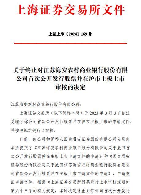 蓝鲸新闻6月27日讯 (记者 金磊)6月26日,上交所发布了《关于终止对江苏海安农村商业银行股份有限公司首次公开发行股票并在沪市主板上市审核的决定》。