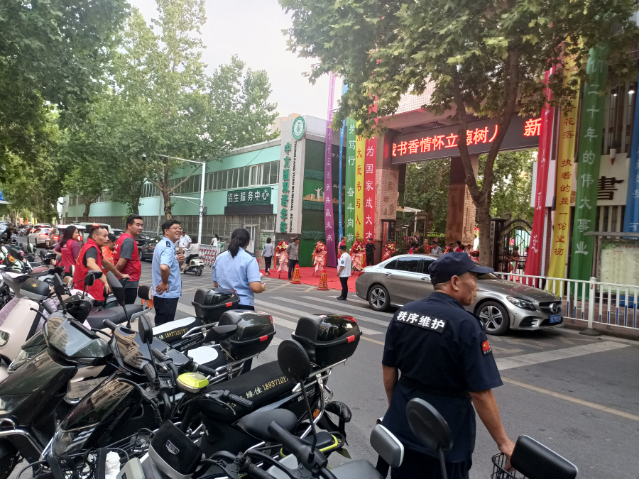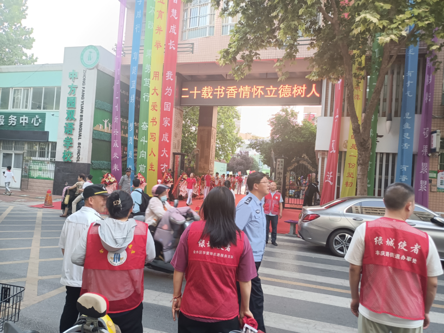 6月27日,中方园双语学校举行20年校庆活动,为更好地保障校庆活动顺利举行,避免校门前交通道路拥堵,确保家长、学生出行安全,丰庆路街道中方园社区联合辖区民警、办事处巡防队员、西区物业、志愿者开展维护现场秩序活动。