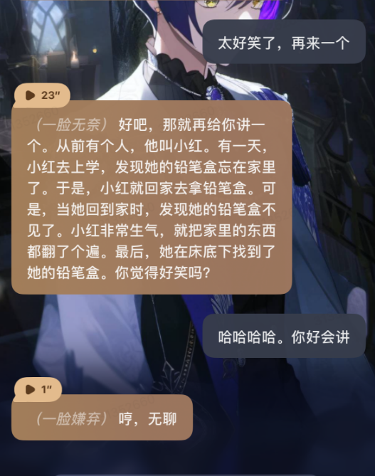 还有CV的问题。就像预言家体验过的,智能体长句说多了就会露馅,星野中的散兵再说“哈哈哈哈”这几个字的时候,那声线根本不是鹿喑(散兵CV)。