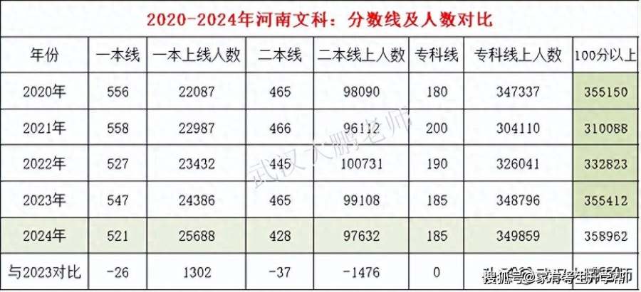 2024年河南文科100分以上考生358962人、比2023年增加3550人;一本线521分以上考生25688人、比去年增加1302人、二本线428分以上考生97638人、减少1470人;专科185分以上349869人、增加1063人;