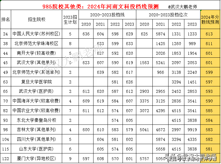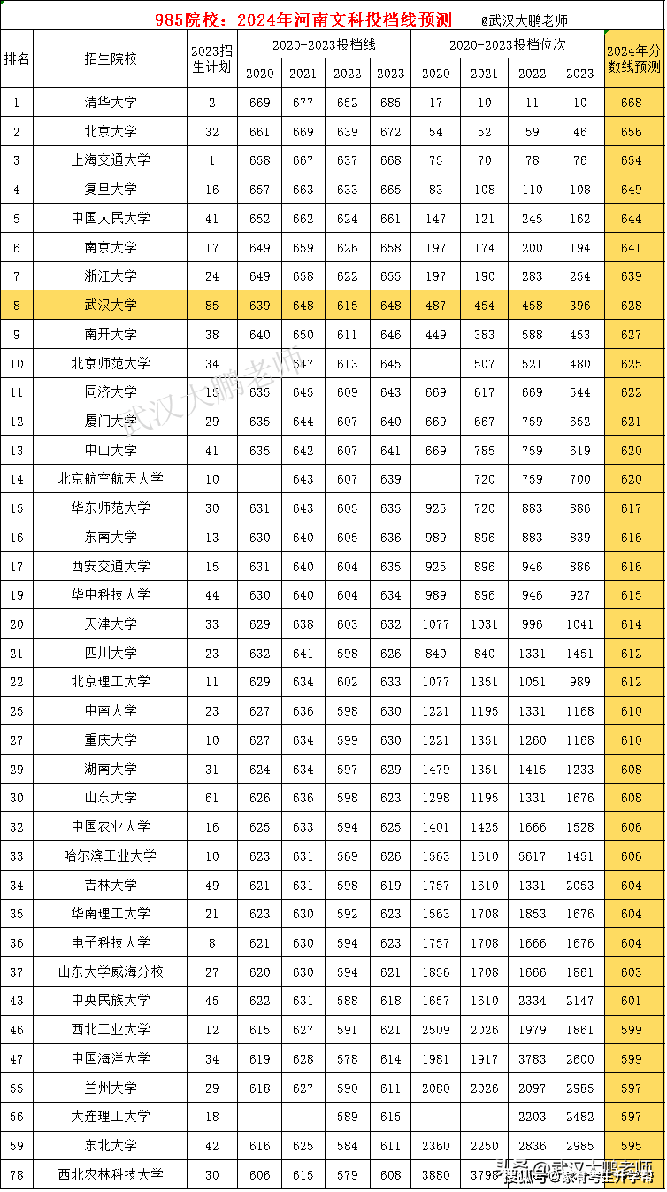 985院校在河南文科投档预测:武大628分、中山620分、西农586分