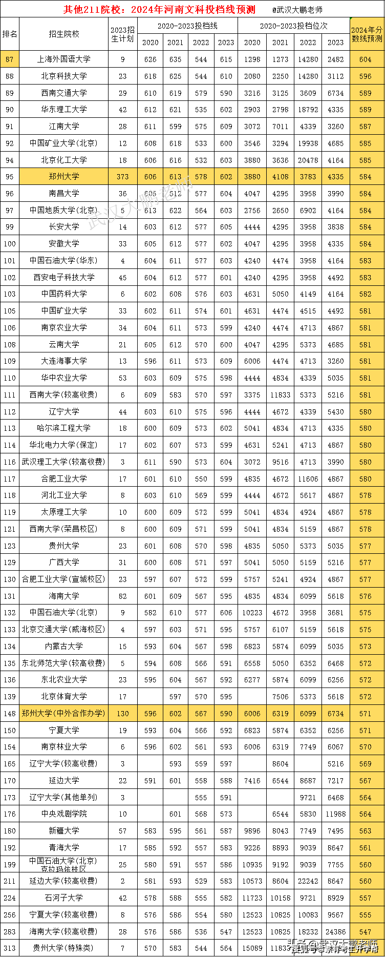 热门211院校在河南文科投档预测:郑州大学584分、郑大中外合作571分。