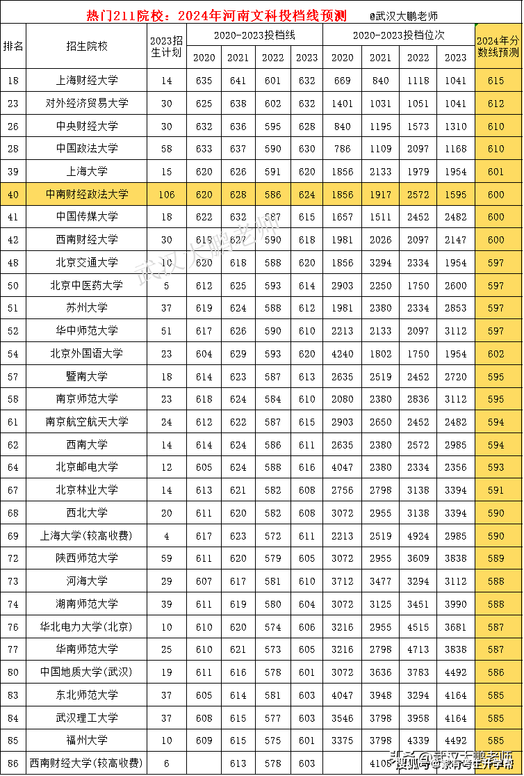 211院校,中南财经政法大学在河南文科招106人,仅次于郑州大学,最近两年分数线普遍低迷。按正常位次预估,中南财经2024预估600分,华中师范预估597分。陕西师范预计587分。