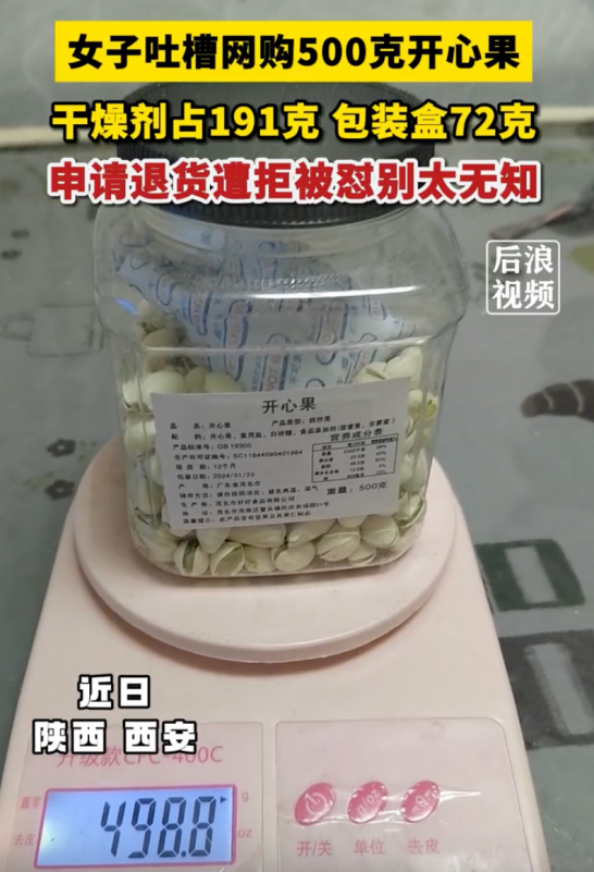 同样在今年,陕西一位网友网购了一袋500克的开心果,结果发现干燥剂就占去了191克,包装盒占了72克,开心果的实际重量一半还不到。