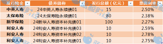 太保寿险、中英人寿选择发行永续债,其中太保寿险发行规模80亿元,票面利率2.38%,中英人寿发行15亿元永续债,票面利率2.5%。