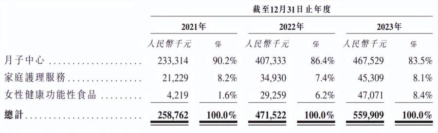 2021年至2023年,圣贝拉分别实现营收2.59亿元、4.72亿元和5.60亿元,其中来自月子中心业务的收入分别为2.33亿元、4.07亿元和4.68亿元,占总收入的比例高达八成,是圣贝拉的核心业务板块。