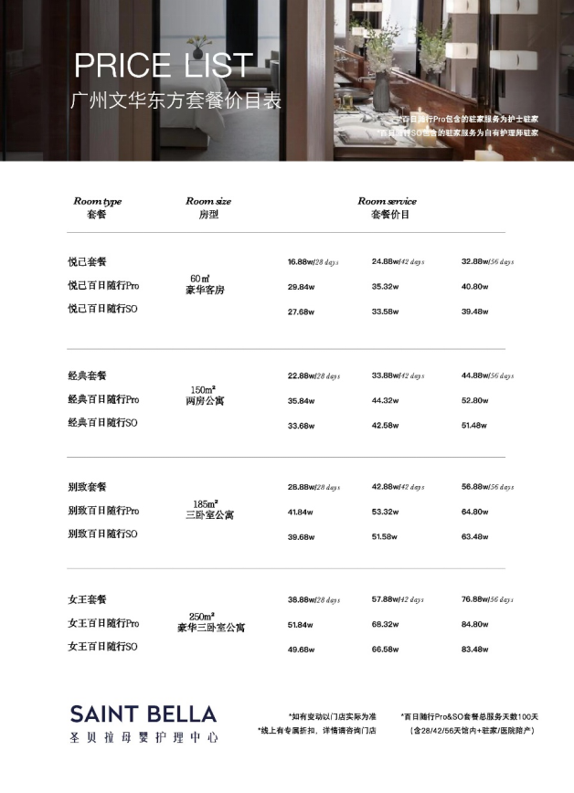 通过微信小程序,贝多财经向客服咨询了圣贝拉广州文华东方店的收费标准。价目表显示,该门店的套餐共分为四种,价格依据房型面积、增值服务数量与服务天数有所不同,最贵的“女王套餐”基础价格高达38.88万元。