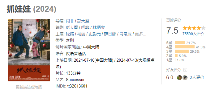 影片将于明日公映,截至发稿其点映和预售票房已突破5.04亿。《抓娃娃》今天在豆瓣开分,有超过7.5万人参与打分,目前显示为7.5分。对于喜剧而言,这是一个不错的成绩。