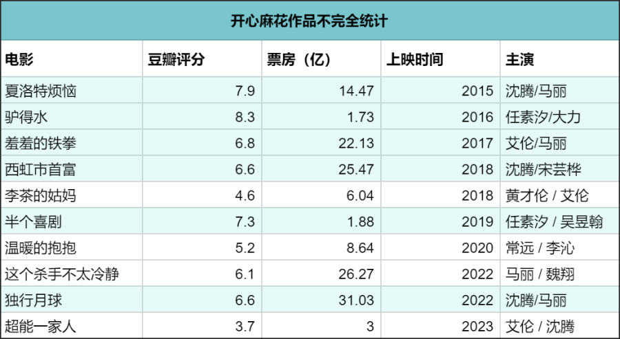 凭借《夏洛特烦恼》,开心麻花一鸣惊人,影视成为其话剧之外的主业。其随后陆续推出了《驴得水》《羞羞的铁拳》《李茶的姑妈》《半个喜剧》等作品。不过这些作品水准不一落差很大,豆瓣评分从8.3跨度到3.7分。