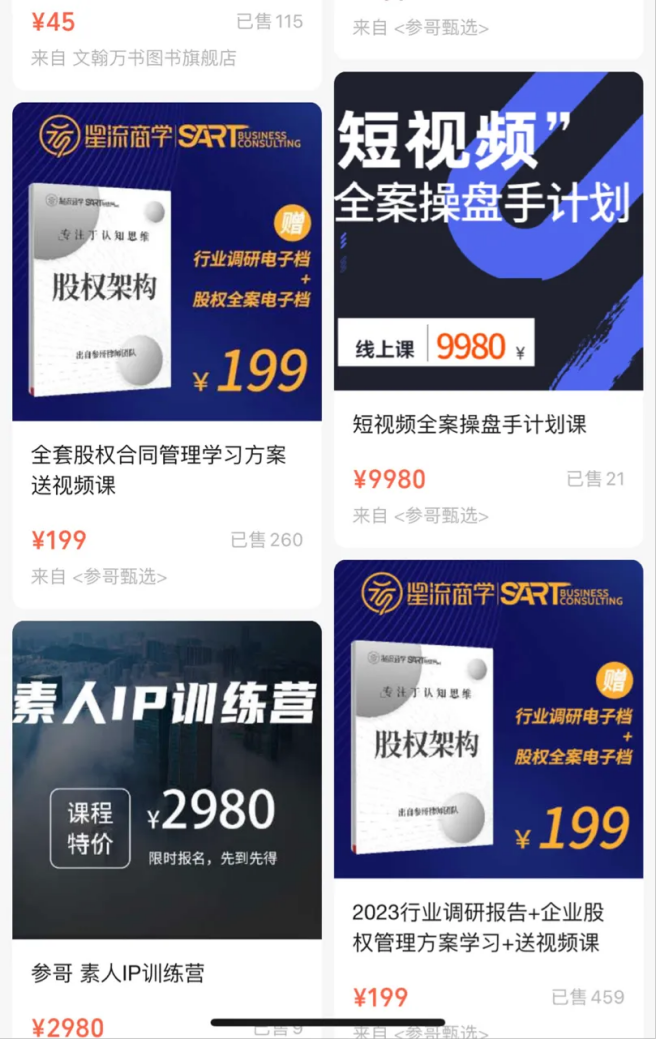 “《短视频流量运营认知课》售价5980元,《短视频全案操盘手》课程卖到9980元,这些在知识付费行业都属于高客单价产品。”学习过参哥课程的程鑫表示,自己去的线下课有500人,课程品类一应俱全,不管是“财商私域”“业务提升”还是“情商管理”,参哥都有相应的定制化服务。