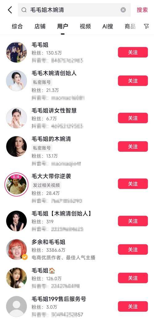 在抖音搜索毛毛姐,也有多个矩阵账号出现,粉丝从几万到百万不等。其账号内容主要涉及家庭关系、女性成长、大健康赛道,通常以自述视角展开,输出女性成长经历、原生家庭关系、健康理念等内容吸引粉丝,随后给出提升思维方式和女性成长的实用路径,再通过日常生活分享加深与粉丝之间的粘性。