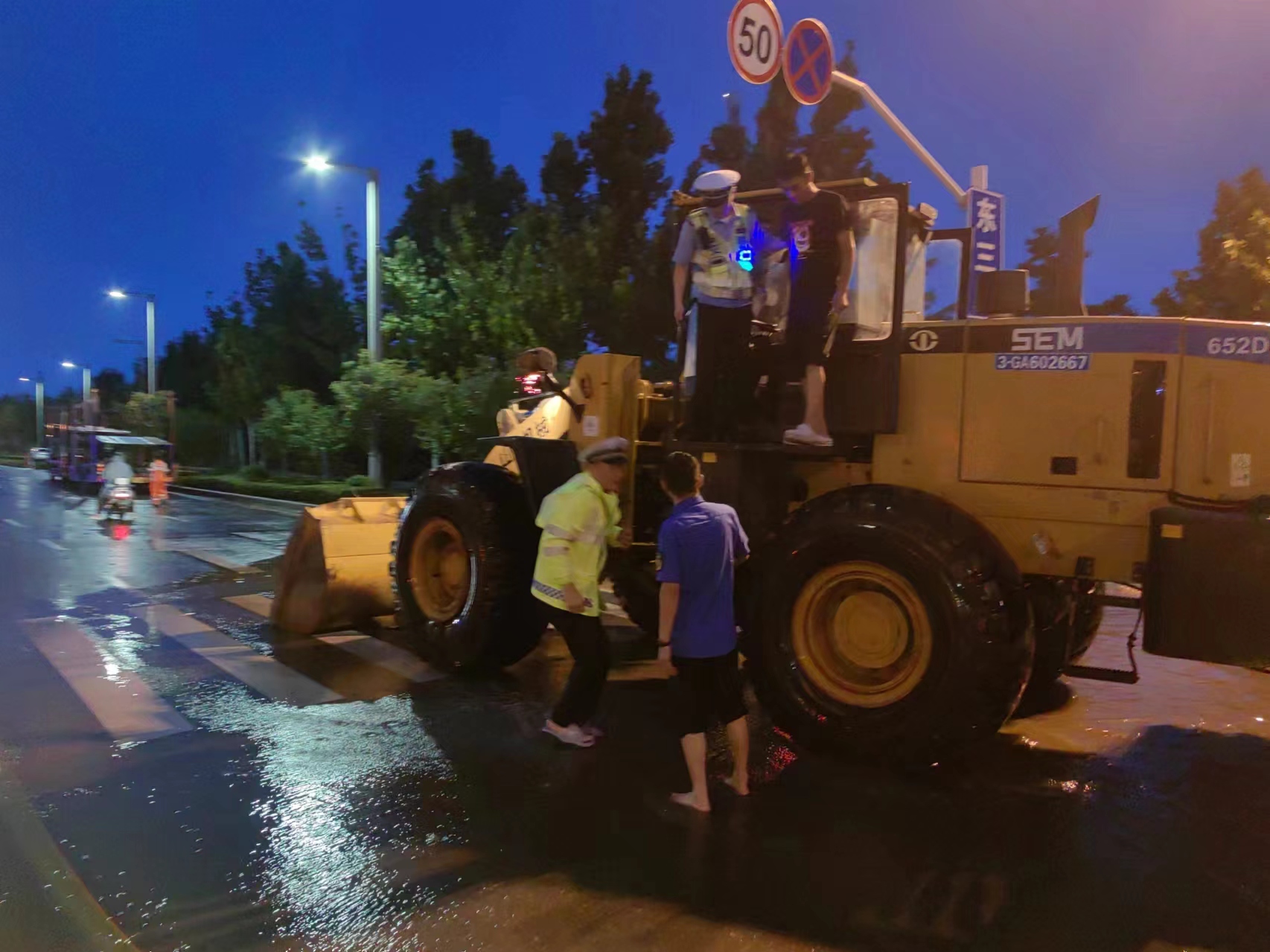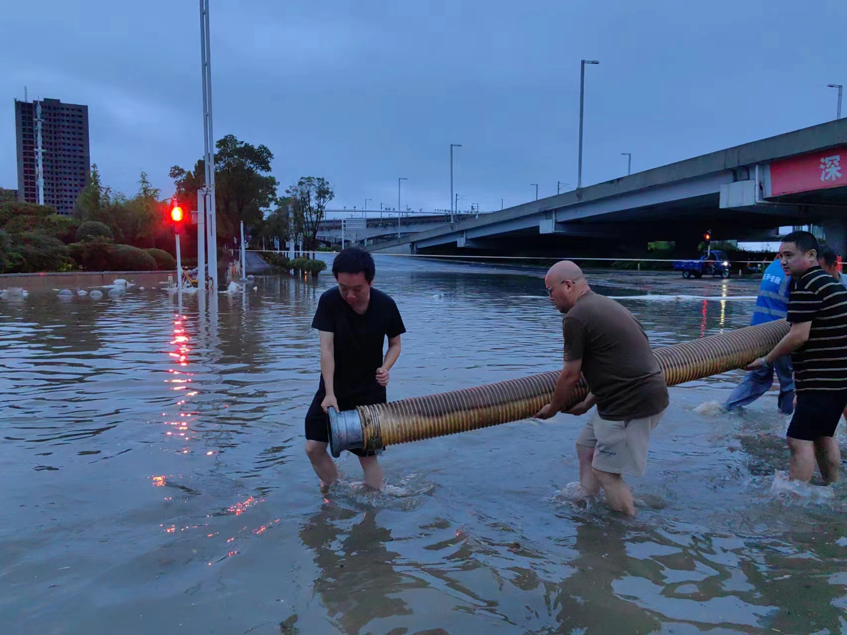 雨中,经开区城管领域全体人员即刻进入“战时”状态。综合行政执法局副局长朱广帅带领抢险人员前往航海路东三环等易积水路段。应急抢险队员迅速打开雨水井盖和雨水篦子;市政专班成员在积水中连续数小时专注操作移动抽水泵。为提升排水效率,区综合行政执法局积极联动交警、市政、绿化等部门,加强与周边社区、企业沟通协作,凝聚防汛合力。