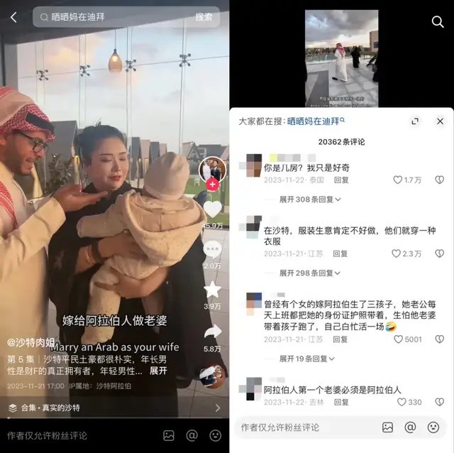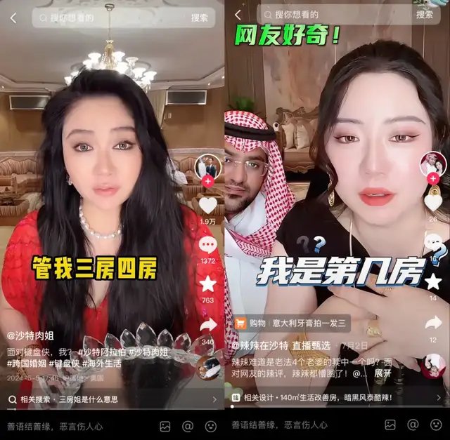 揭秘的同时,跨国差异也让这些博主本身多了一层神秘感。尤其是“远嫁沙特”的博主们,总会被质疑“是第几房”,尤其是此前@沙特肉姐在视频出现了2个小孩,更是被质疑是大房的孩子。