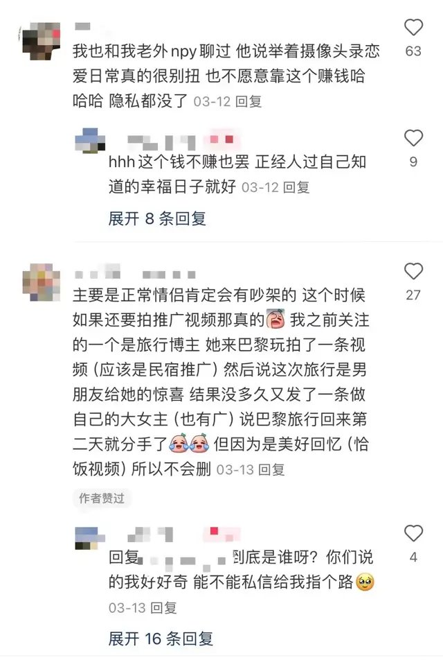 “找点白男说点女性鸡汤,就可以成为精神领袖”、“这些情侣博主要买两人完全没有爱、纯为了赚钱,要么两人中至少有一个NPD”、“我和我的老npy聊过,他说举着摄像头录恋爱日常真的很别扭,也不愿意赚这个钱”......不少网友提到。