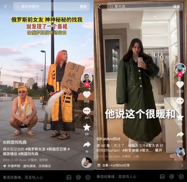 相比之下,“中男外女”的异国恋博主所展现的情感没那么细腻,人设更多走的是搞笑路线。例如中俄情侣@跨国刘先森主要靠土味段子吸粉;中美情侣@KatAndCat的视频中,女生往往会以“奇怪的中文口音”、穿军大衣等,来展现一个大大咧咧、美而不自知的搞笑形象。