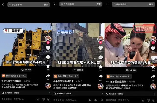 而且对比@沙特肉姐和@辣辣在沙特,虽然背后没有关联相同的MCN,但从变现逻辑、甚至切片话术上,几乎是同一个模子刻出来的,就连分享的内容也大同小异,而且视频中两人的沙特老公都与香水产业有点关系。就连网友也时常分不清楚,“沙特肉姐和辣辣在沙特是同一个人吗?”