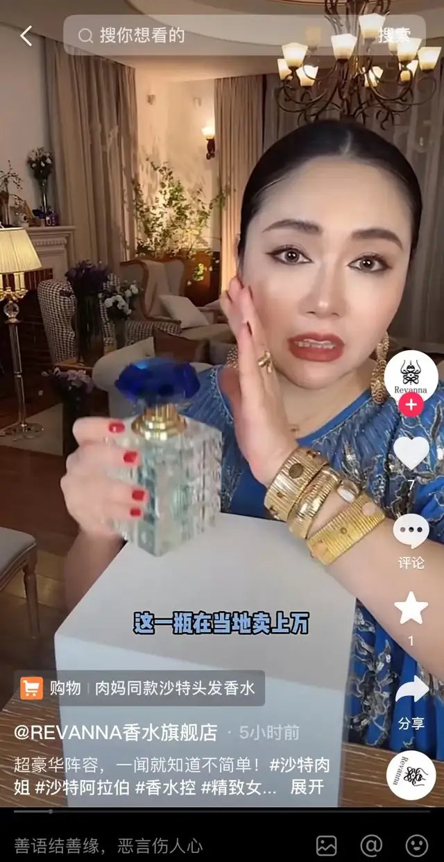 早期说“不缺钱、不带货”的@沙特肉姐不仅开始直播带货,甚至还凭流量创立了自有品牌REVANNA,推出了珠宝、香水、沉香、美妆等不同支线品类及各自的店铺。同时,还在频繁带一款“叙利亚古皂”。