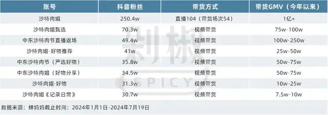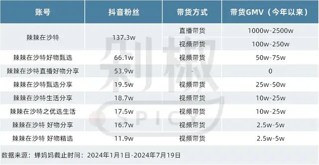 虽然争议不断,但@沙特肉姐的确通过带货赚到钱了。蝉妈妈数据显示,今年以来@沙特肉姐已直播104场,其中带货场次54,总计GMV超1亿。而其他矩阵账号以“视频带货”为主,单个账号总带货GMV在几十万至上百万不等。