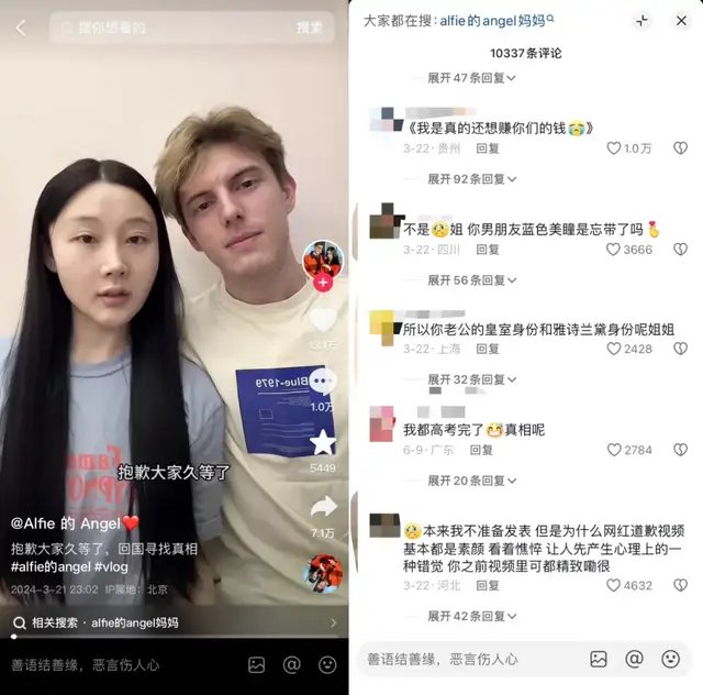 前阵子,拥有400万粉丝的头部跨国情侣博主@Alife的Angel塌房,女方母亲被曝卷入诈骗案件,被判有期徒刑14年。借由此次塌房,粉丝们纷纷重翻旧账,声讨博主在视频中塑造的虚假人设。