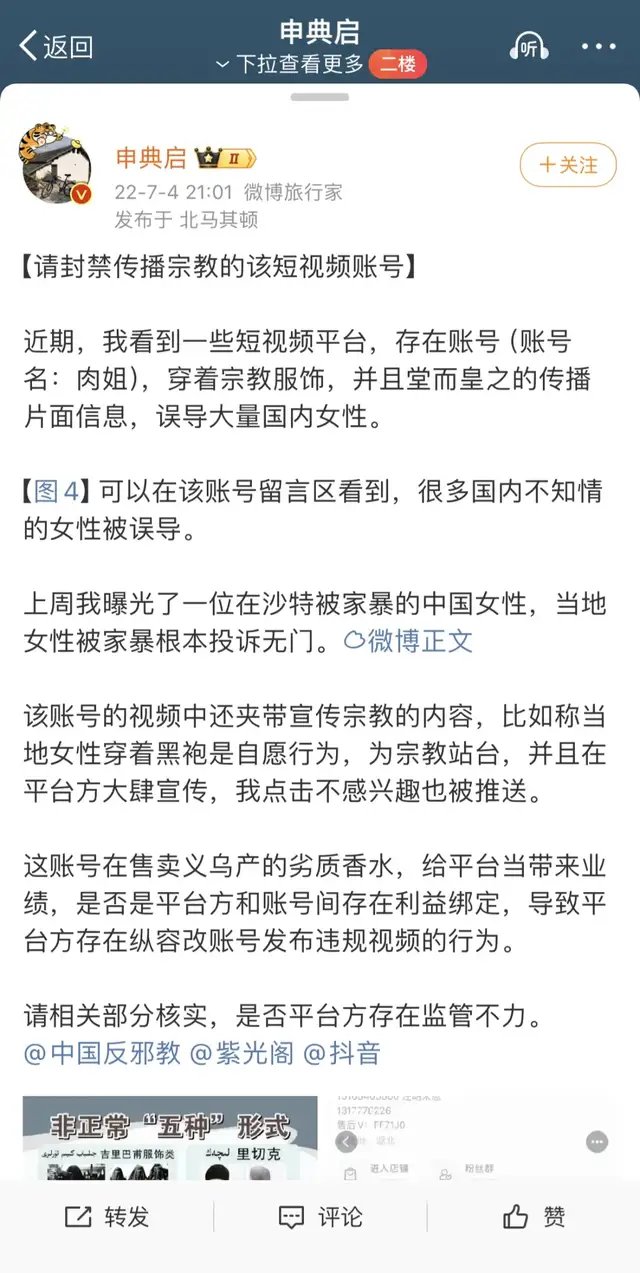 早在2022年就有旅游博主@申典启公开举报博主@沙特肉姐“误导国内女性、为当地宗教站台、售卖义务劣质香水”,但该举报并无后续。