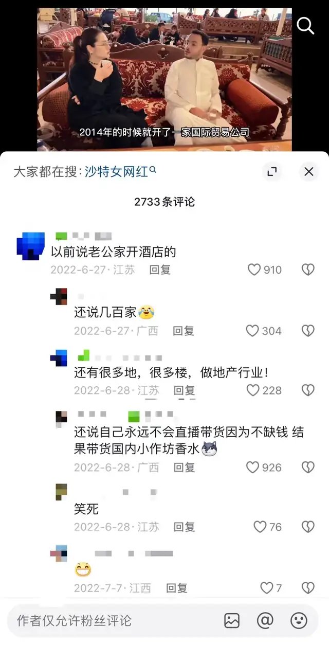 对此,@沙特肉姐在视频中表现出对这种质疑的不屑,也回应过“自己不至于做别人的小老婆”。甚至还为沙特丈夫塑造了一个知名企业家、不大男子主义、老婆身边的背景板等更符合国内网友期待的人设。