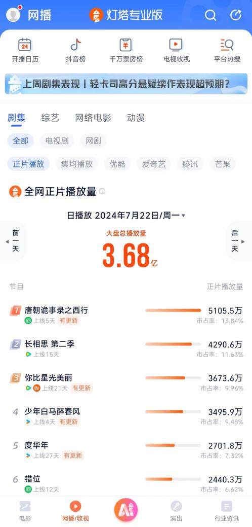 暑期档的热播剧集争夺战,可以说是长视频平台之间竞争态势的缩影。各大平台的热门剧目,不仅能够即时反映出当下内容创作的流行趋势,还能清晰地揭示出用户流量的走向,以及平台IP商业化运作上的实力与策略。