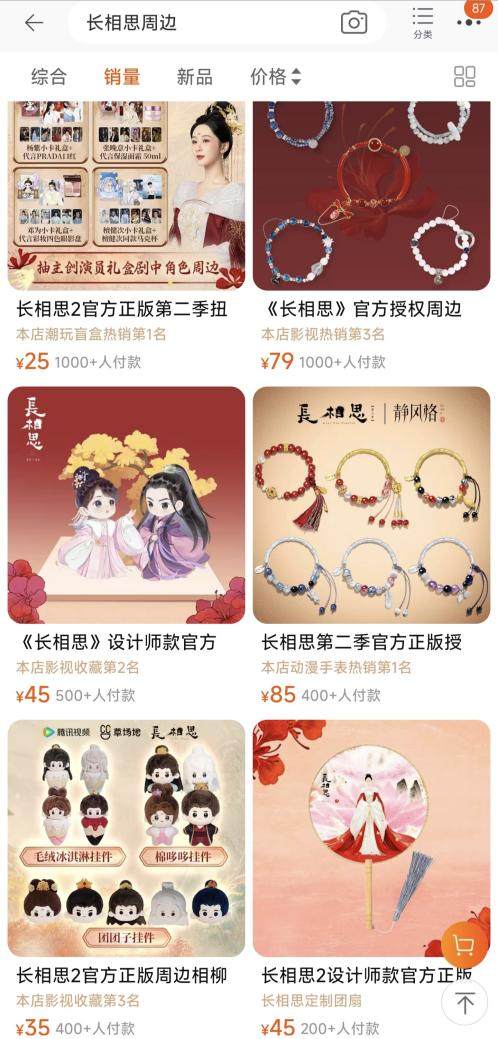 长相思这个IP,也被开发成综合商业,其天猫官方旗舰店里,扭蛋、手串、毛绒公仔等每周销量达200+,最贵售价228元的官方设定集,也有超500人的加购。